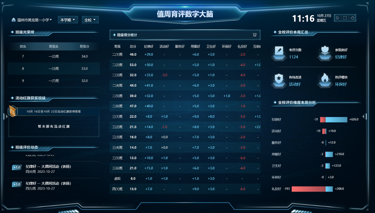 数据服务学校育评数字驾驶舱:实时动态呈现学校育评成果校园值周数字大屏:自动生成学生、班级、寝室评比报告、学校管理好帮手学校育评进度报告:教研工作好顾问、实时监测教师日常各项育评工作开展情况学科育评监测报告:教务开展好参谋综合分项等级报告单、综合素质报告、校园数字画像&学校育评大脑校园数字画像&学校育评大脑